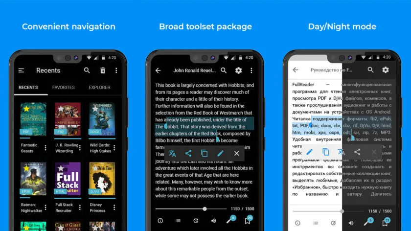 FullReader (trước đây là FReader) là một ứng dụng đọc sách nổi tiếng và được ra mắt gần đây. Hỗ trợ nhiều loại tệp sách điện tử cũng như những loại ít phổ biến hơn như CBR và CBZ (truyện tranh), cùng với MP3 cho sách nói. Giao diện người dùng cổ điển và bố cục đơn giản. Một số tính năng khác bao gồm hỗ trợ sao lưu đám mây với Google Drive và Dropbox, chế độ tối AMOLED và trình dịch hoạt động với 95 ngôn ngữ. Ứng dụng này hoàn toàn miễn phí. Có thể đóng phí(không bắt buộc) nếu bạn muốn hỗ trợ việc phát triển app.